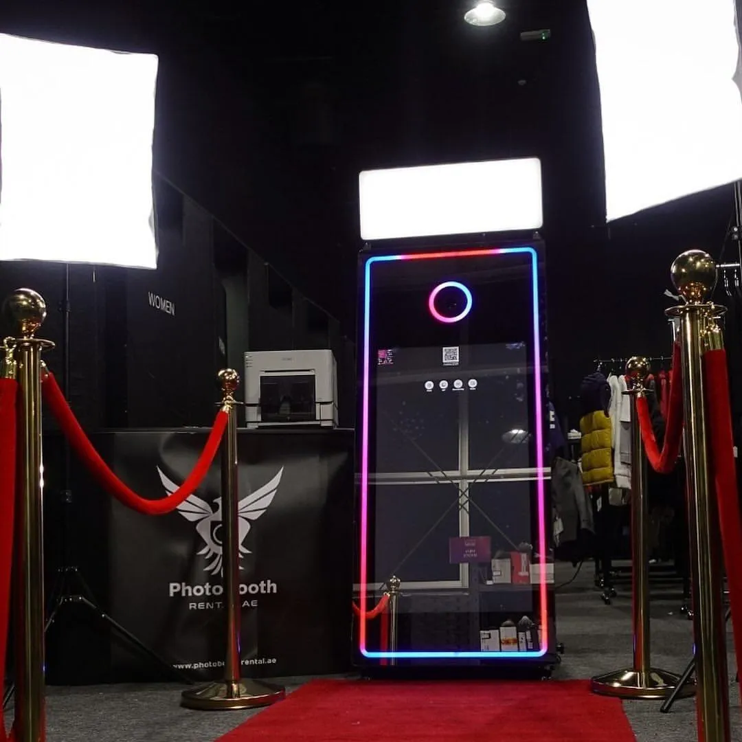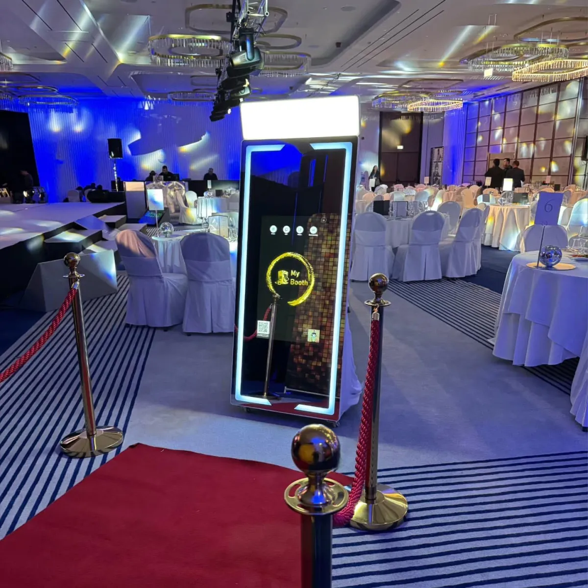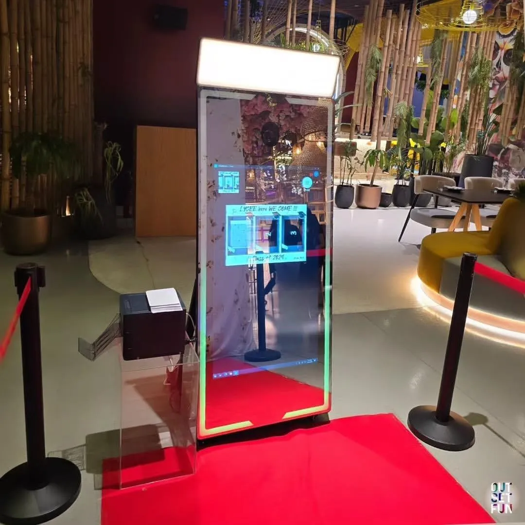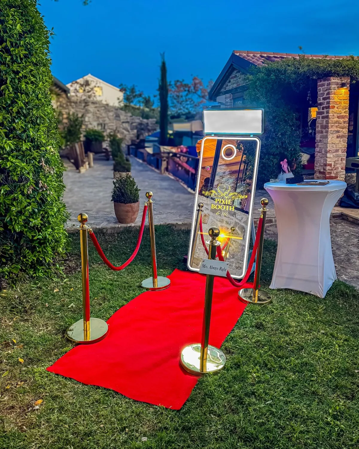 We recommend a minimum area of 10x10 feet to comfortably accommodate the Mirror Photobooth and props table.